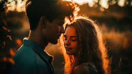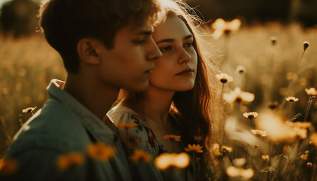 Sunset shot of couple about to kiss in flower field. Generative AI
