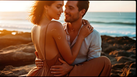 Couple shares a romantic moment on the beach during sunset while enjoying each others company in a serene atmosphere