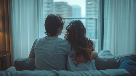 Beautiful young couple is hugging and smiling while sitting on sofa at home