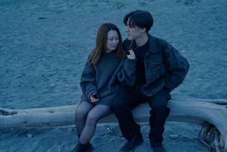 Two figures stand close together in the city, their faces illuminated by the soft glow of streetlights.