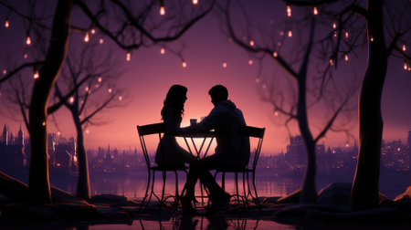 Silhouette of a loving couple sharing stories under colorful bokeh lights during a romantic sunset