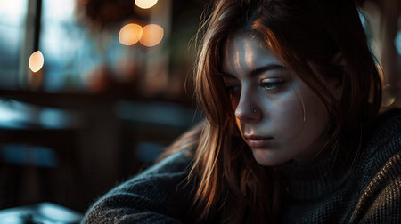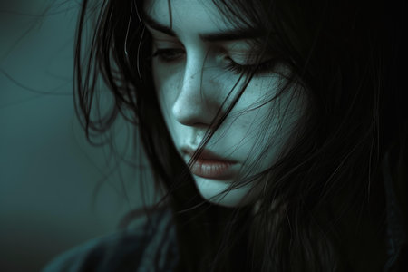 Young woman lost in thought, her somber expression highlighted against dark backdrop, emphasizing a deep sense of melancholy and introspection. Problems with mental health. Copy space. Generative AI