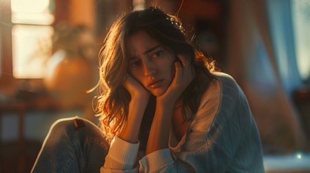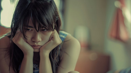 Young Asian woman with a sad expression sitting comfortably at home in a cozy atmosphere reflecting on her feelings during a quiet moment in the afternoon