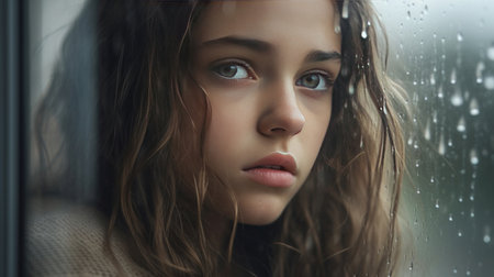 A beautiful young girl sad and depressed looking out of the window with raindrops on the glass window on a rainy day.
