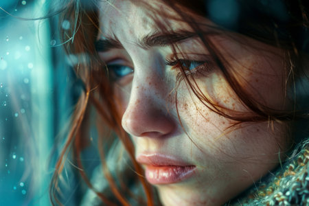 This intimate close-up captures a person in deep contemplation, highlighting the emotional weight of their expression, with tears reflecting light and shadow play.