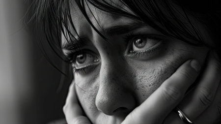 Woman Overcome with Sadness and Grief on a Dark Studio Background