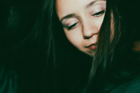 Close-up portrait of young caucasian female with intense expression in dramatic lighting.