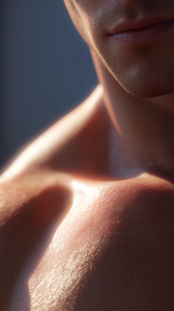 Close-up view of a glistening shoulder and neck under soft light in a serene setting