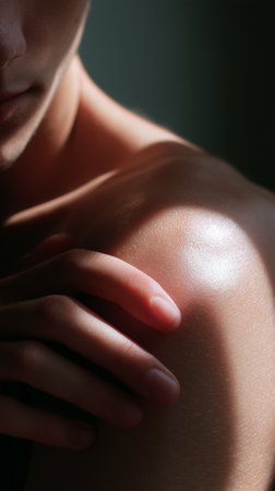 Close-up view of a persons shoulder and hand with soft lighting highlighting skin texture