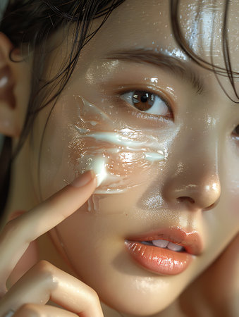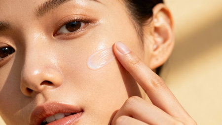 Luminous skin texture on Asian woman's face, highlighted by natural sunlight, showing a clear moisturizing product applied to the cheek by one finger against a soft yellow background.