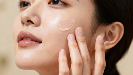 Extreme closeup of a woman's hand and fingers spreading a thick, translucent skincare product or cooling gel onto the smooth, luminous skin of her upper cheek.