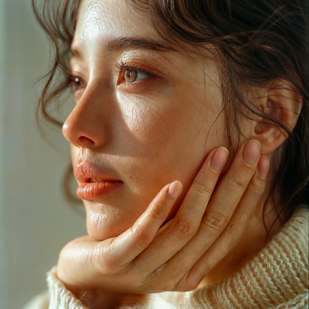 Woman with clear skin and minimal makeup gently touching her face, emphasizing natural beauty with a soft smile and warm lighting