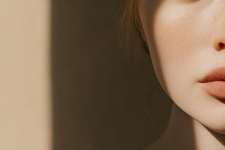Close-up of young caucasian female with shadow on face and smooth skin.