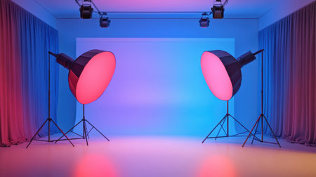A stunning photography studio featuring vibrant pink and blue lighting, showcasing softboxes and a clean backdrop, perfect for artistic shoots.