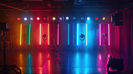 A creative studio lighting setup featuring vibrant neon lights in pink, yellow, and blue shades, providing a dynamic and futuristic backdrop with two studio lights.