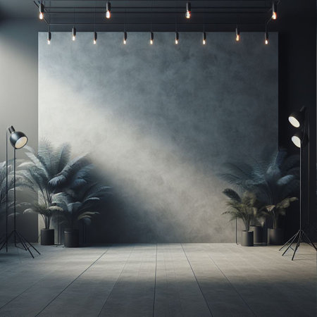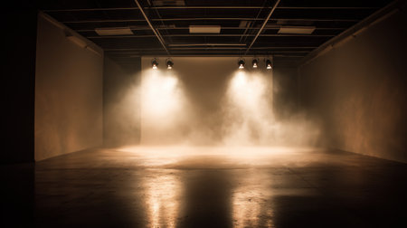 A spacious empty studio featuring dramatic lighting and fog effects, ideal for artistic photography sessions, creative projects, and dynamic visual productions.