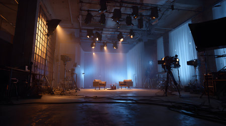 Modern photography studio featuring professional lighting setup and empty chairs, perfect for capturing stunning visuals in a creative environment.