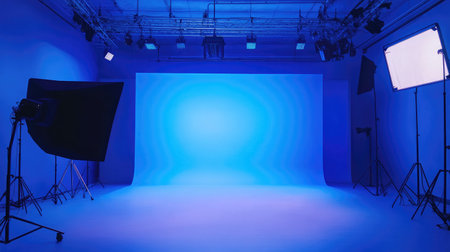 A modern photography studio featuring an empty blue backdrop and carefully arranged soft lighting equipment, ideal for various creative projects.
