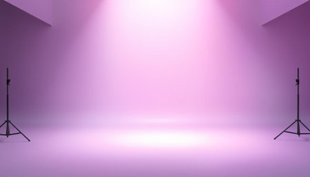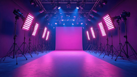 Vibrant photo studio with bright pink lights and professional equipment. Suitable for photography, media production, and artistic themes.