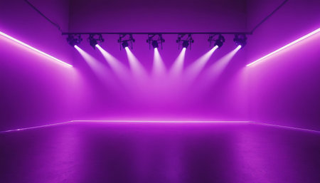 Shiny metal spotlight illuminates stage in dark nightclub performance space generated by artificial intelligence