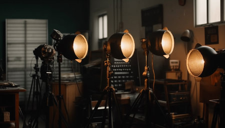 Studio lighting room isolated on black photo stand. Illuminated lamp spotlight movie object. Generate Ai