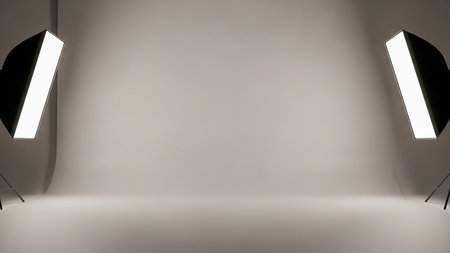 An empty photography studio with a neutral seamless backdrop and two professional softbox lights positioned on either side.