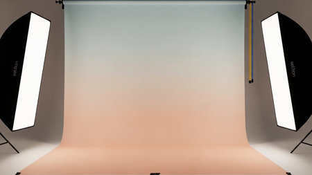 A photography studio setup with a seamless paper backdrop featuring a gradient from peach to blue and two softbox lighting fixtures on stands.
