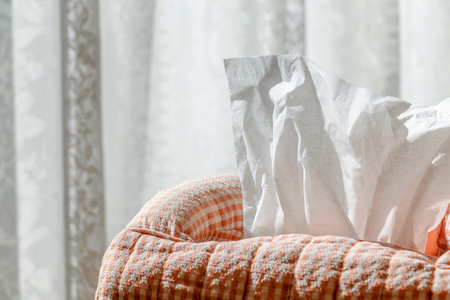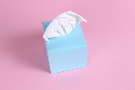 A wooden tissue box sits on a bright surface with tissues spilling out. Soft, natural light casts shadows across the scene, highlighting the textures of the wood and paper. A delicate floral element adds a touch of nature. The image is suitable for various commercial uses and presentations.