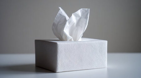 Gentle white tissues gracefully extend from a textured box, resting on a sleek surface against a neutral backdrop, symbolizing cleanliness and daily comfort.