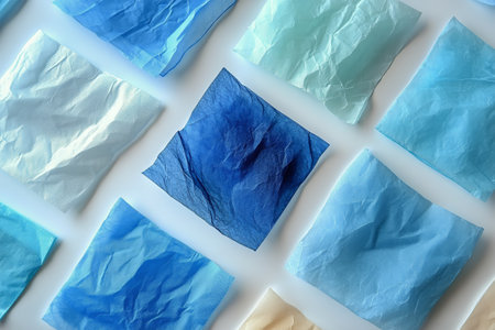 A flat surface showcases an assortment of crumpled tissue paper pieces in different shades of blue and light colors. Ideal for artistic projects or decorative uses.