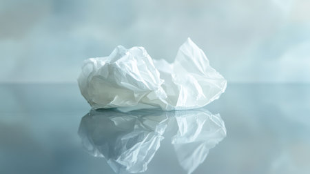 A soft-focus image of crumpled white tissue paper resting on a reflective surface, showcasing delicate textures and a minimalist aesthetic suitable for various creative projects.
