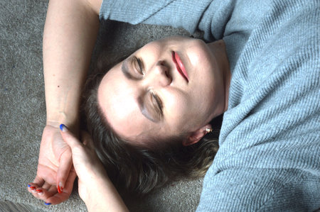 Side view portrait of relaxed woman with long hair lying on carpet at home. She is dressed in a blue tracksuit, holding a phone in her hands.