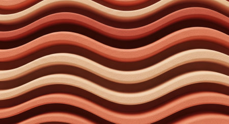 Abstract digital illustration with multiple horizontal undulating wave like layers in warm earthy tones, creating a dynamic and rhythmic pattern, ideal for backgrounds or design elements.