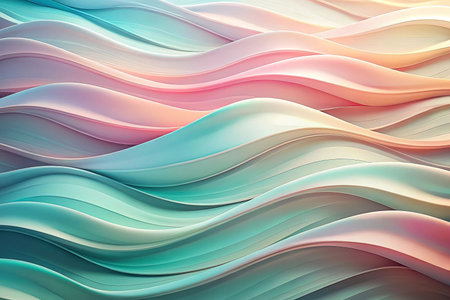 An abstract composed of layered pastel waves in soft blues, greens, and pinks, featuring gentle curves and subtle...