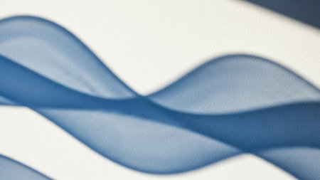 Gentle blue wavy shadows flow across a textured white surface with diagonal light streaks creating a soft abstract...