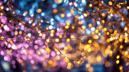 Captivating evening scene showcasing vibrant bokeh effects from decorative lights wrapped around branches, creating a magical winter atmosphere in nature.