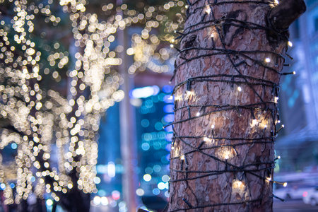 Twinkling garland lights illuminate the scene casting a warm glow against a blurred night backdrop filled with soft circles of light perfect for evening walks.