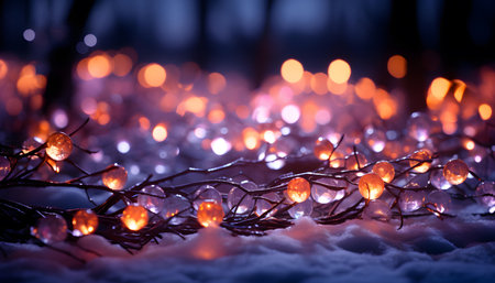Glowing Christmas lights illuminate the winter night generated by artificial intelligence