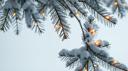 A serene winter scene featuring a snow-covered pine branch and soft bokeh lights.