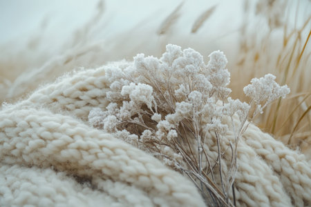 Cozy cream knitted blanket features delicate dried flowers on top, creating a warm and inviting scene, ideal for seasonal decor and comfort aesthetics