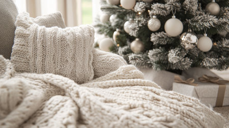 Elegant Christmas Decor with Pine Branches, Baubles, and Cozy Knit Blankets for Holiday Designs