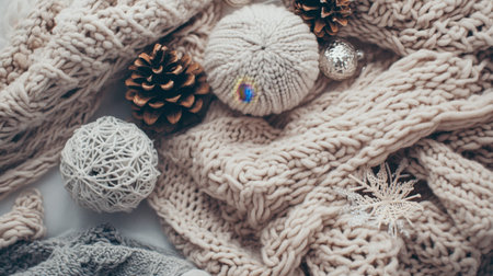 A serene arrangement of cozy textures featuring knit yarn, pine cones, and decorative ornaments on a soft blanket, creating an inviting winter atmosphere.