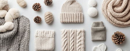 Cozy Winter Composition with Knitted Accessories, Snowflakes, and Seasonal Decor Elements