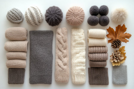 Cozy winter fashion flatlay with knitted sweaters and accessories