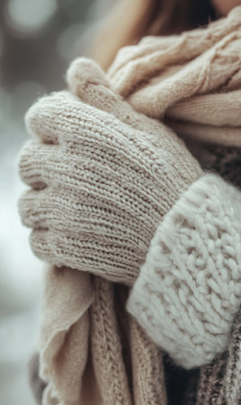Close-up of gloved hands holding a scarf, wool gloves