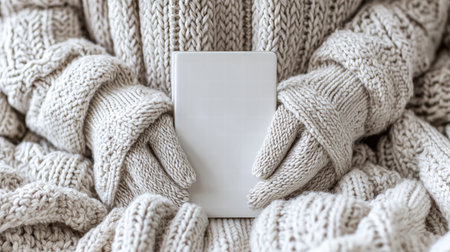 A pair of cozy hands clad in a knit sweater holds a blank notebook on a soft, textured blanket, perfect for winter creativity and relaxation.