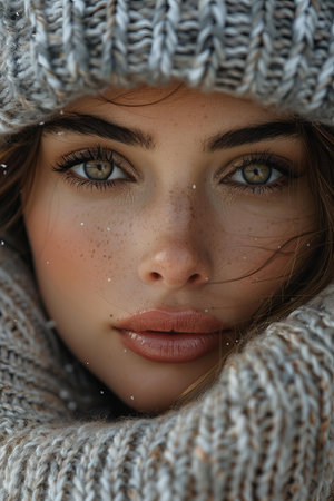 A serene winter portrait featuring a model in cozy knitwear surrounded by delicate botanical elements, capturing the beauty and warmth of the season.