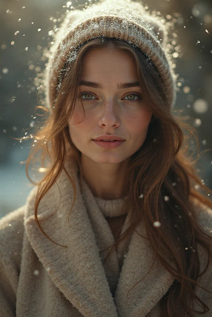 Winter wonderland stroll with a graceful model in soft snow
