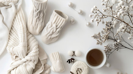A delightful winter arrangement featuring cozy knitted sweaters, a charming gift box, and festive decor, creating a warm and inviting atmosphere perfect for holidays.