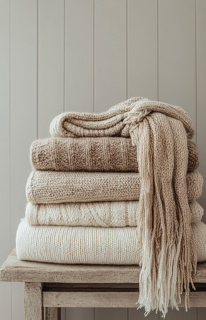 A stack of beige and white sweaters and scarves neatly folded on a table, exuding warmth